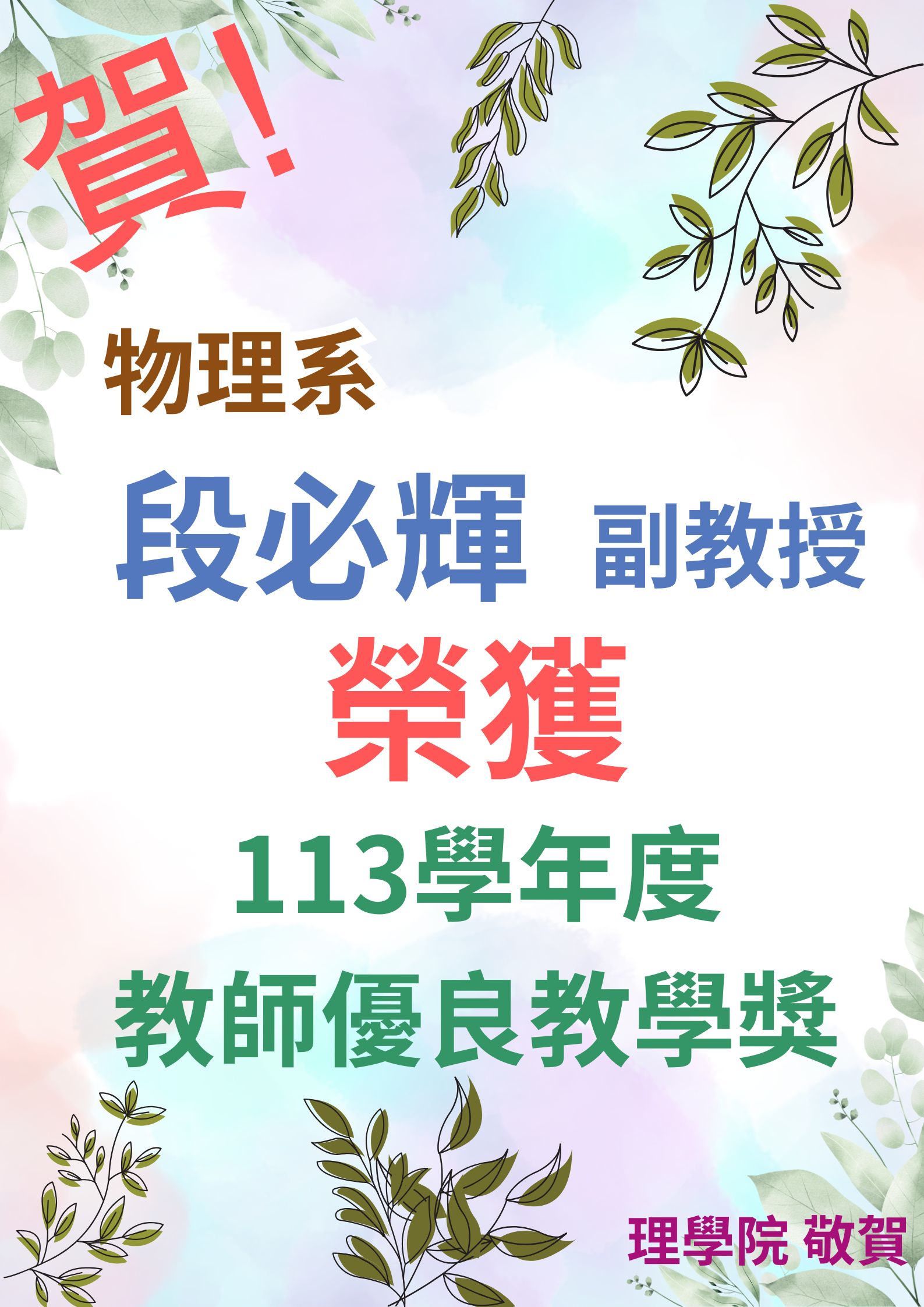 ~賀~物理系段必輝副教授-榮獲113學年度教師優良教學獎