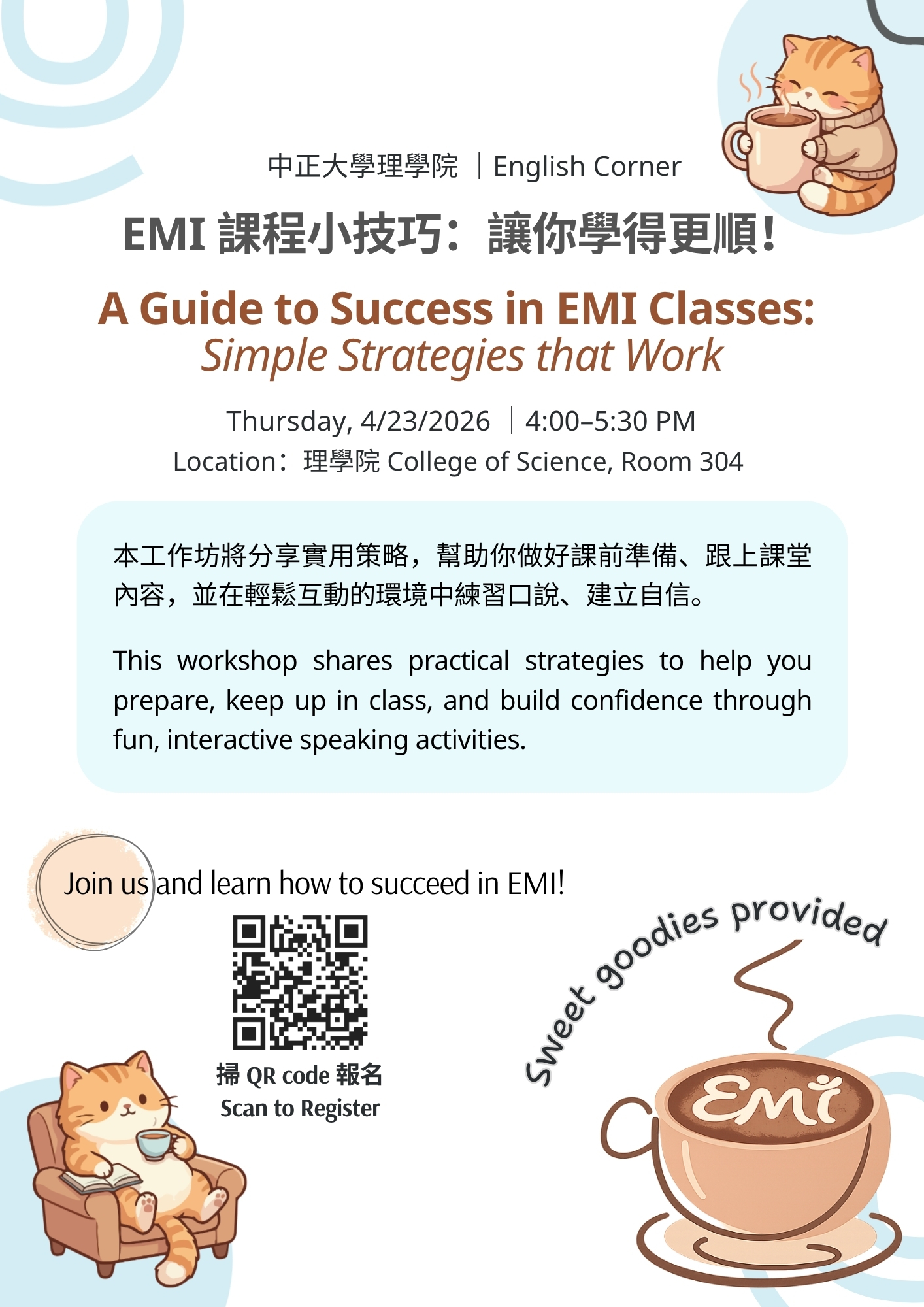 還在為全英語上課(EMI)感到焦慮嗎?本工作坊將介紹實用的應對策略,幫助你在課前做好準備,並在課堂中順利跟上與學習。工作坊中也安排了有趣、輕鬆且具互動性的活動,讓你能在輕鬆且充滿支持的學習環境下練習口說、運用所學策略,並逐步建立開口說英文的自信。